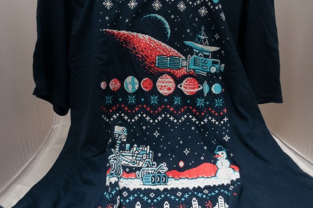 This month’s shirt is an “Ugly Christmas sweater”. The people at Loot Crate made a space exploration 8-bit design to commemorate all the achievements from NASA this year. My inner astronomer is happy.