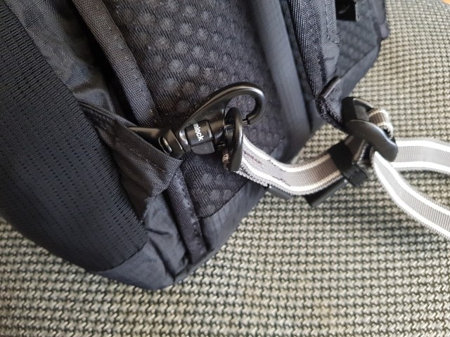 Another anti-theft feature is the eXomesh slash guard. The slash guard is a metal net that is between bag fabrics. The net doesn’t cover the whole bag, just the bottom half of the bag. This stops thieves from cutting your bag open and running off with what’s inside. The bag straps also have metal wires which prevent cut and run theft. The strap also comes with a turn and lock security hook which can be attached to a fixture. This helps prevent snatch and grabs.