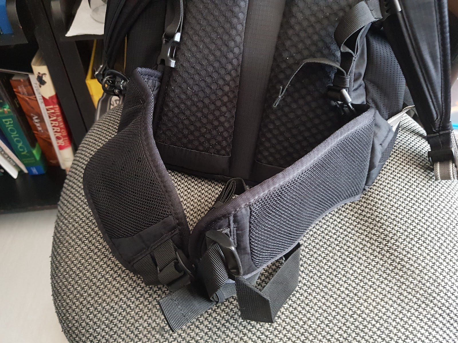 This bag comes with an aluminum support which helps with load transport as well as a hip belt. The hip belt can be stowed away when not in use. Their is also an adjustable sternum strap. If you load up your bag with some heavy stuff this support can take the load from your shoulders and transfer to your hip, making long walks not too bad.