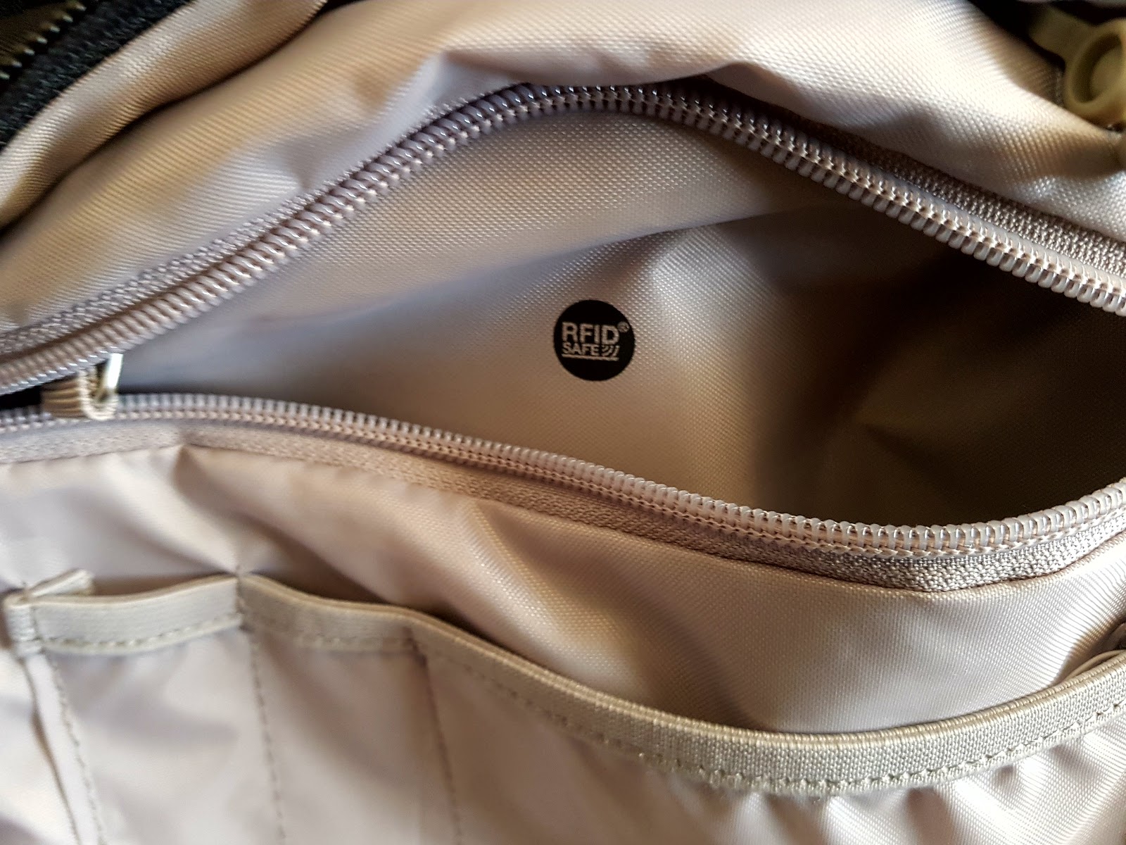 The bag comes with an RFIDsafe pocket for credit cards and passports. This pocket prevents RFID skimming. Most passports have RFID chips as well as some credit cards. My cards do not have an RFID chip so my passport was the only one that needed to be safe.