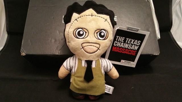 A Leatherface plushie! It’s the cute horror line from Kid Robot. They also made the face sucker from Aliens that was in a previous crate.
