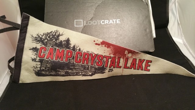 Camp Crystal Lake is from the Friday the 13th series. It is the home of Jason Vorhees. This pennant is really cool and I need to find a way to hang it in the “closet”.